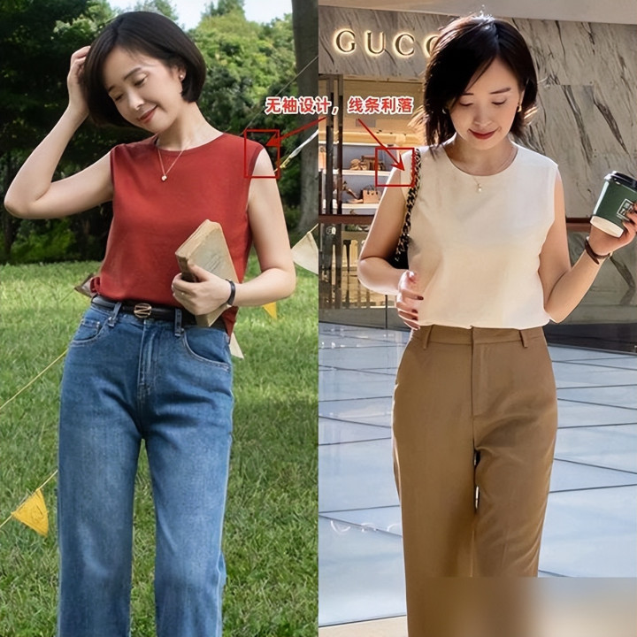 有人担心无袖显胳膊粗其实袖口只要比大臂最粗处宽一厘米副乳就被隐形了再戴一条细项链视觉重心上移谁还盯着拜拜肉看?
